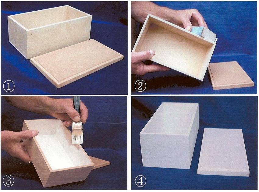 As the box chosen was new fibreboard, the initial preparation was simple, but if your box is of grained wood, always sand with the grain rather than across it. Increase the coarseness of the sandpaper to suit the roughness of the wood, but always finish with a finer paper. Our box has no hinges, but if yours has, make a note of their position and remove them with any other hardware before preparation. Make sure you take note of which way round the lid fits, and if necessary, mark it.