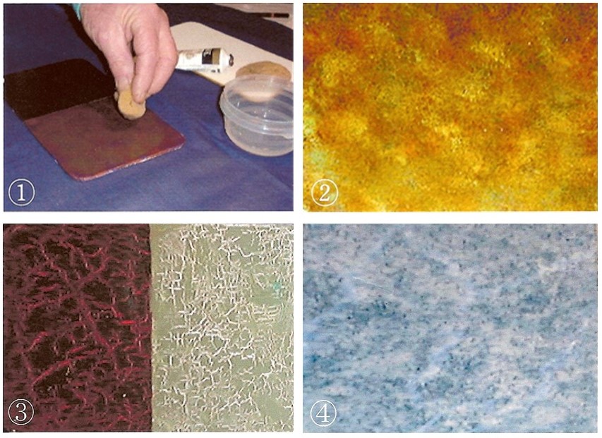There is also the choice of paint: emulsion, acrylic or oil-based. Once chosen, this will dictate the type of varnish, which can be used on top of it, i.e. you should not use a water-based varnish on top of an oil-based painted finish. An oil-based varnish will then have to be used, with the associated longer drying time, turpentine brush washing and some yellowing of the finish, which can affect the appearance of some colours in the design, particularly blues and pinks. If this all sounds daunting, fear not, you can try your proposed paint background on a small piece of hardboard or similar material. In fact, this is always a good idea and you will surprise yourself with the results, especially when sponging colours wet on wet.