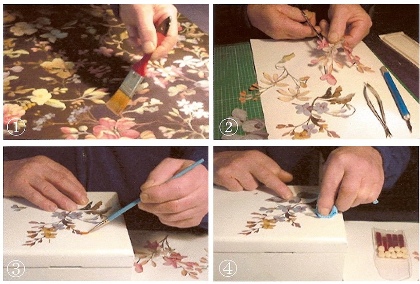 If you have spent time and effort on producing a fine piece of decoupage thus far, then in my view it also deserves a find finish. The aim of varnishing is both to protect your work and to enhance its appearance. Before cutting out your design, seal the face of the paper with a coat of sealer (water-based varnish or acrylic spray). This strengthens the paper and makes cutting easier. The scissors normally used are the cuticle type with sharp fine curved points. Cut with the points facing away from you. If you are new to cutting, have a couple of black and white photocopies of your print made and practise on those.