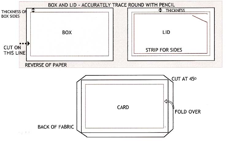 For a fabric lining you will need to measure and cut accurately a piece of thin card for each side and bottom of the base and lid - 10 pieces in all. Place the bottom piece of card in the box with a piece of cotton or ribbon underneath so as to allow its removal. Place in the side pieces and trim to allow a snug fit. You will need to allow for the thickness of the fabric.