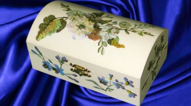 Start by gluing the larger pieces first. You may prefer to apply the glue to your cut-outs by laying them face down on a piece of wax paper and lifting the cut-out with the paper to the box. Alternatively, you can apply the glue to the box and lay your cut-out onto it. Place a damp (not wet) cloth onto the cut-out and press down. You may also wish to apply slight pressure with a roller. Check for air bubbles or lifted edges, continue applying your design. Gently clean away any excess glue as you progress with a damp sponge cloth or cotton bud, working away from the edge of the design.