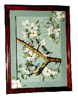 It may be helpful to put a “Band-Aid” on back of a large piece such as this branch after shaping, gluing and shaping again. To do this attach strip of paper to each side of shaped branch to help branch keep its curve. Glue to branch from the back: (Illustration 3.) Cut and shape dogwood blossoms. To make stamen: “feather” quilling paper on one side, roll to form a tight coil, touch tips with a little paint for realism and add to flower centers. (Illustration 4) Add some of non-elevated print to corners of mats on both elevations. Assemble and mount composition. Silicone sealer can be placed under larger sections of birds/branches to give more dimension, but it should not show.