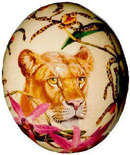 An important step when designing an egg is to keep in mind you have a flat print for a curved surface-more so than with a lamp or bowl because of its egg shape. (The top curves-the bottom curves and you want your design to flow all around.) It’s not just clipping to get it to fit. It sometimes requires reshaping your print. Making a black and white print to experiment on your egg surface can be very beneficial. This is not necessary each time, but in the beginning it’s best. Try not to rush this part of the process because the time taken to get the feel of the egg and know where to clip ahead of time lets you work more efficiently on the finished product. It is important to keep scissors and tweezers close by when gluing to snip and remove any edges necessary to give a proper fit.