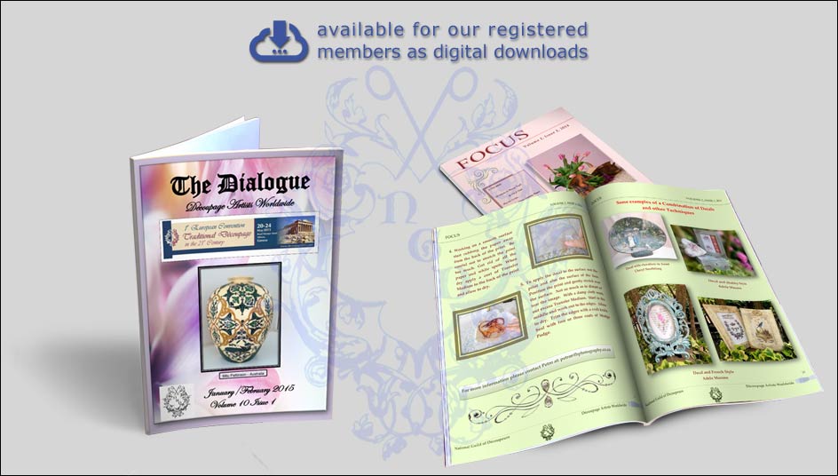 Are you thinking of becoming a member of Decoupage Artists Worldwide. Click on the following links to download a free copy of our digital magazines The Dialogue and Focus on D.A.W.